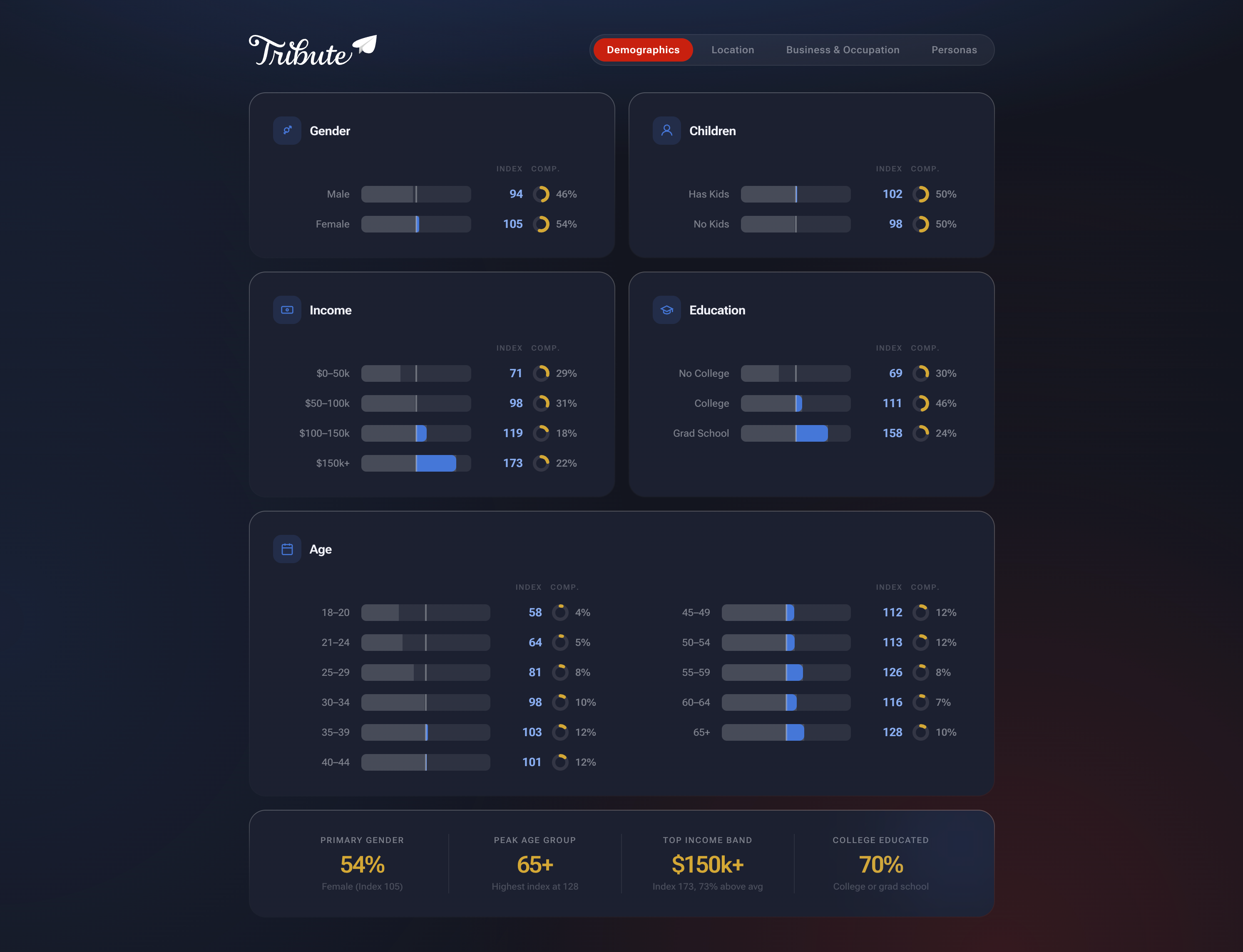 On the business side, the dashboard surfaces industry, occupation, and seniority data sourced through Dun & Bradstreet’s audience intelligence layer. This gave us a clear picture of not just who our users are personally, but what they do professionally and where purchasing power sits.