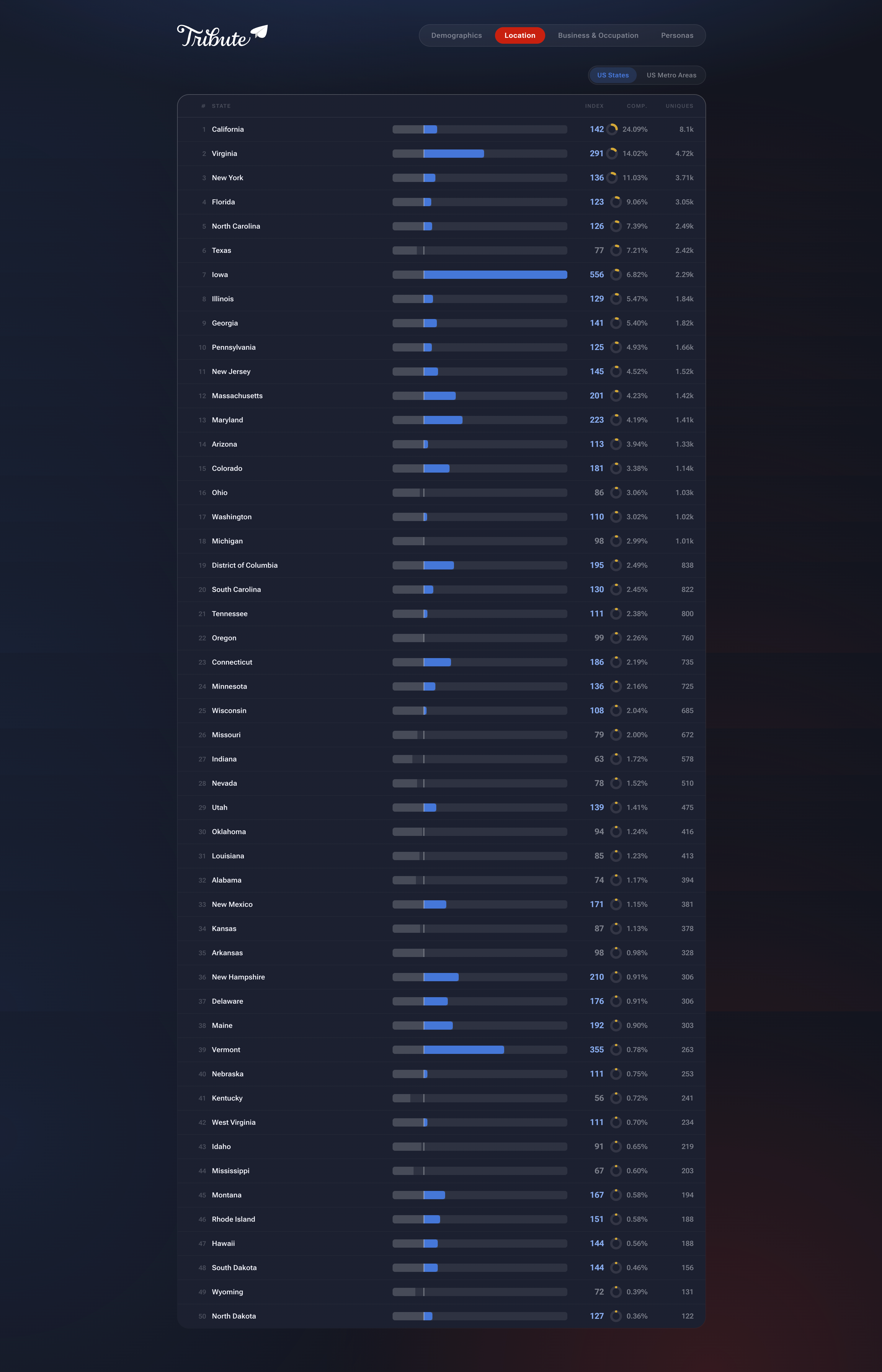 Design decisions are only as good as the data behind them. Early in V3, I realized we were making targeting and prioritization calls based on gut instinct and anecdotal support tickets. We had Quantcast running on the site, but the default dashboard wasn’t built for the questions we needed to answer: who exactly is using Tribute, where are they, what do they do for work, and which segments should we optimize for?