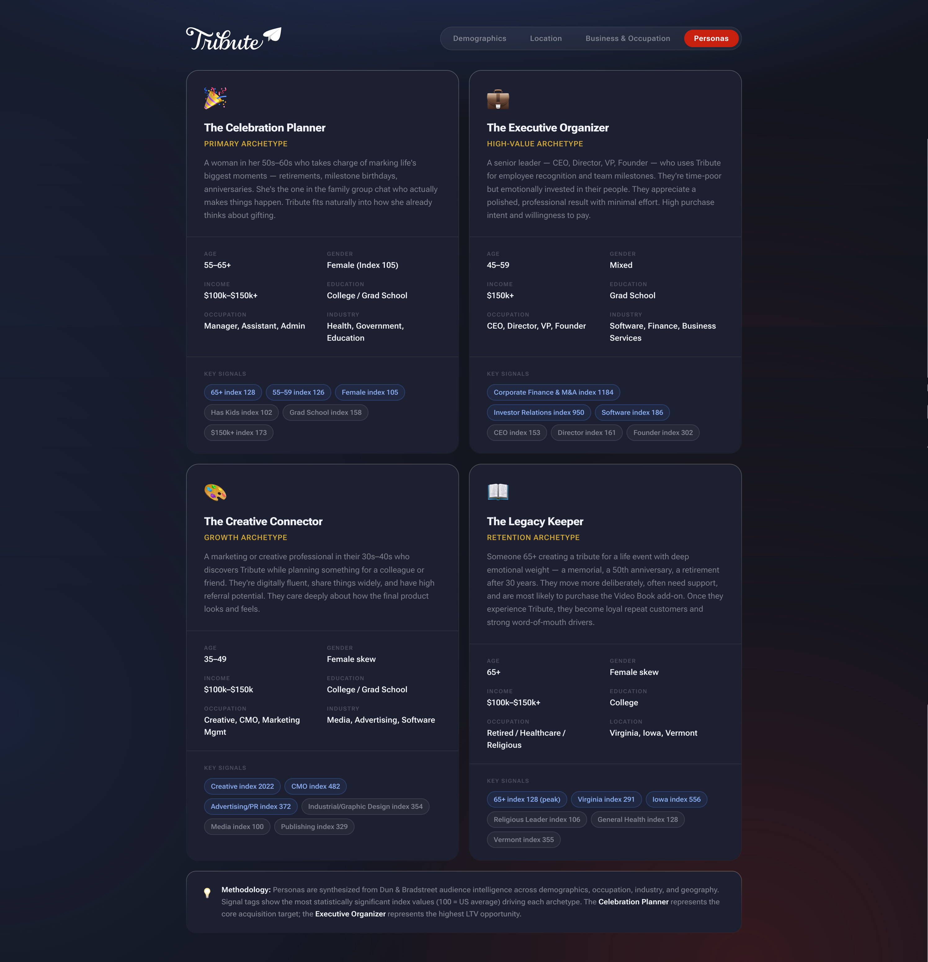 The Celebration Planner is our primary archetype and core acquisition target: women 55-65+, college-educated, household income $100k-$150k+, working in health, government, or education. She’s the one organizing retirements and milestone birthdays in the family group chat. Tribute fits naturally into how she already thinks about gifting.